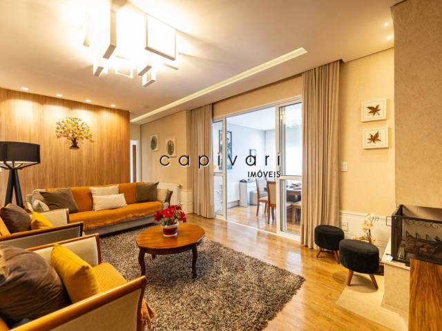 Apartamento 3 dormitórios, sendo 1 suíte, 1 banheiro social, lavabo, salas de estar e jantar integrados com lareira, varanda gourmet com churrasqueira e forno a lenha com vista para o jardim e para a piscina.